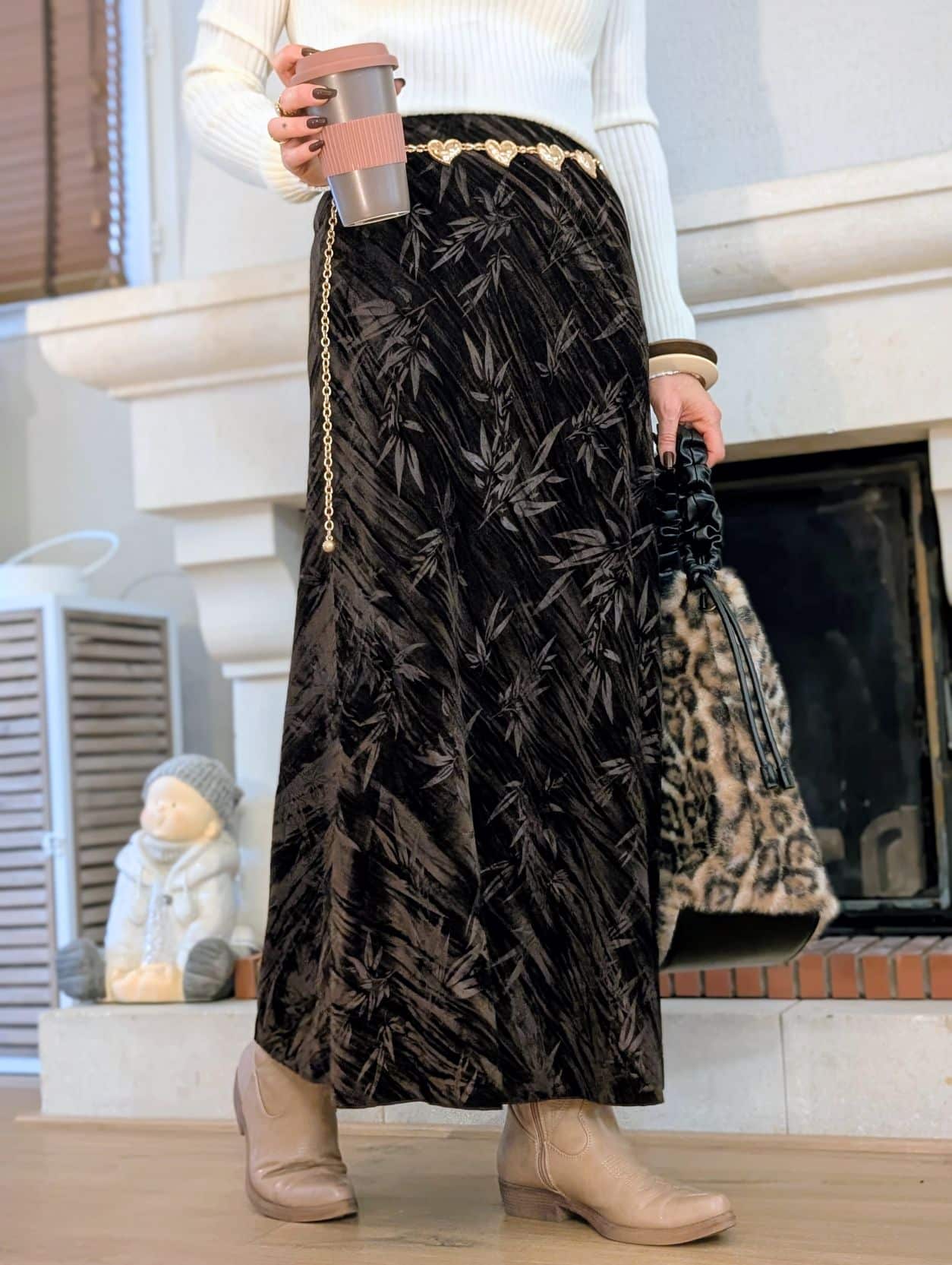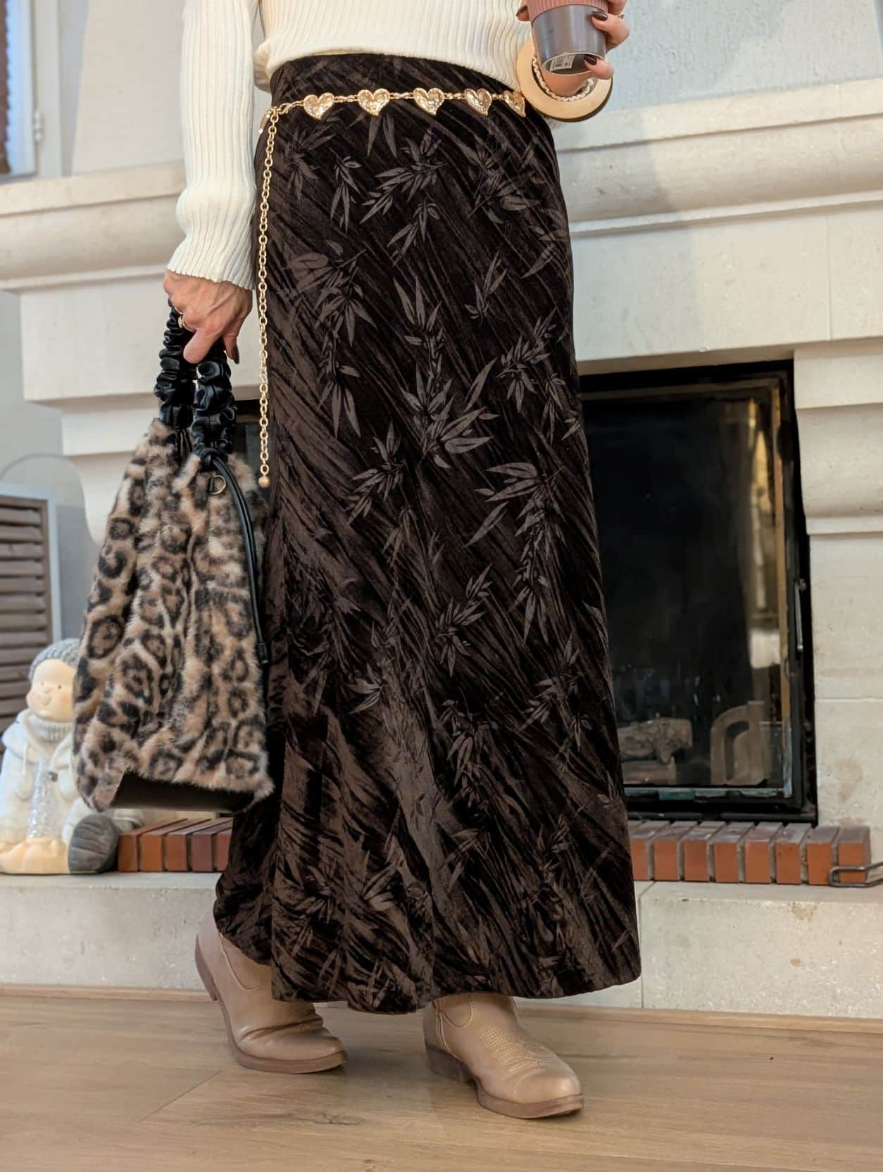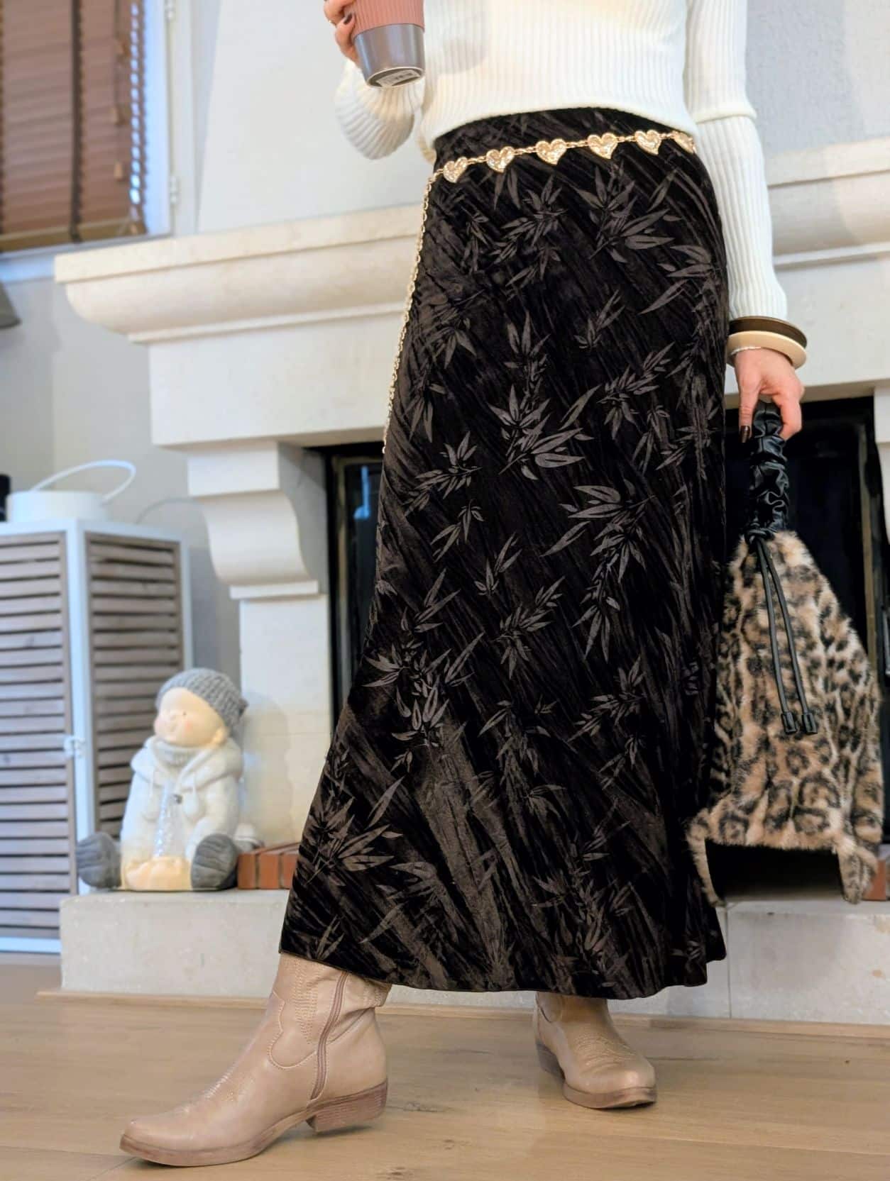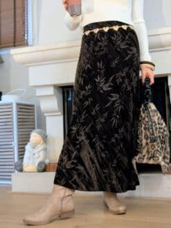 Laissez-vous séduire par cette jupe longue au toucher velours et aux motifs floraux délicats.🍃