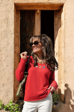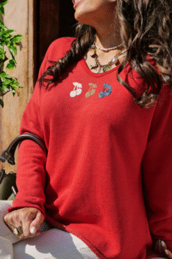 ✨ Pull rouge en maille légère avec broderies cerises multicolores