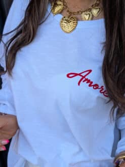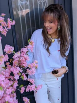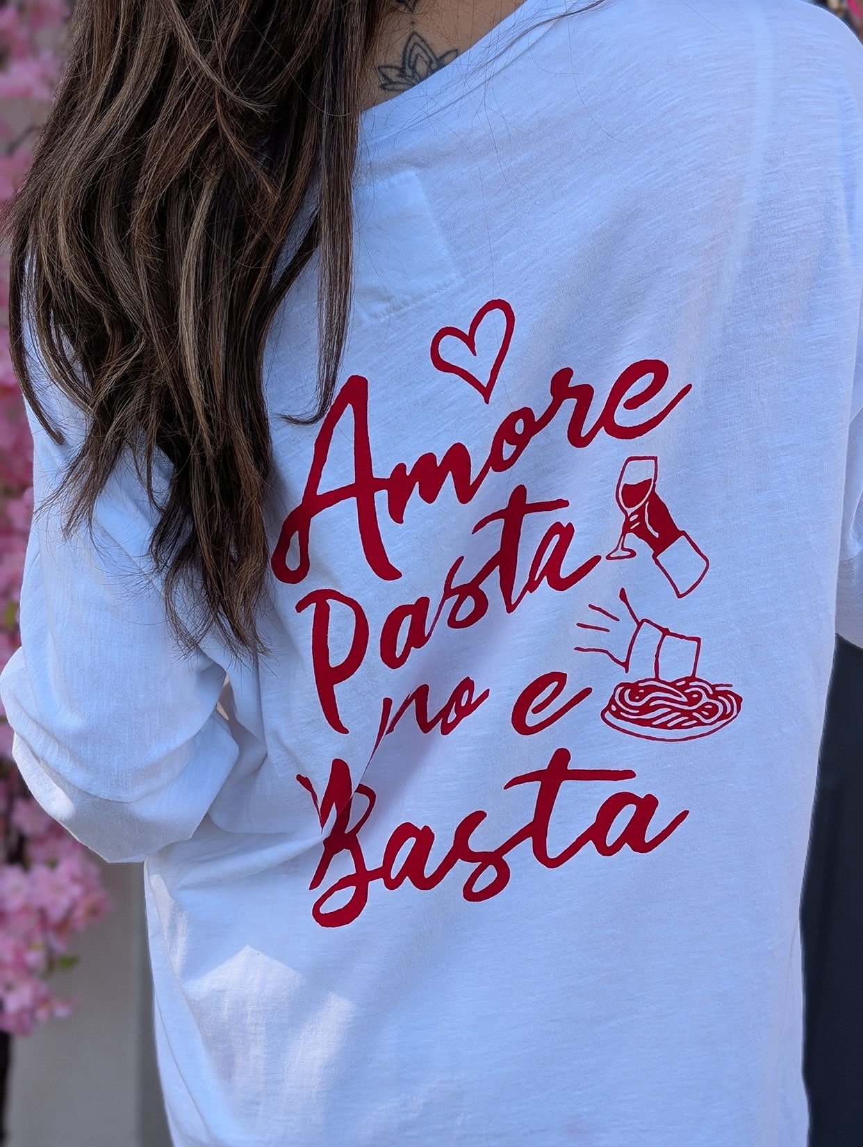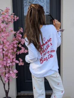 Même avec un top blanc qui se laisse personnaliser par ses imprimés « Amore, Pasta, Vino e Basta » : soyez stylée !