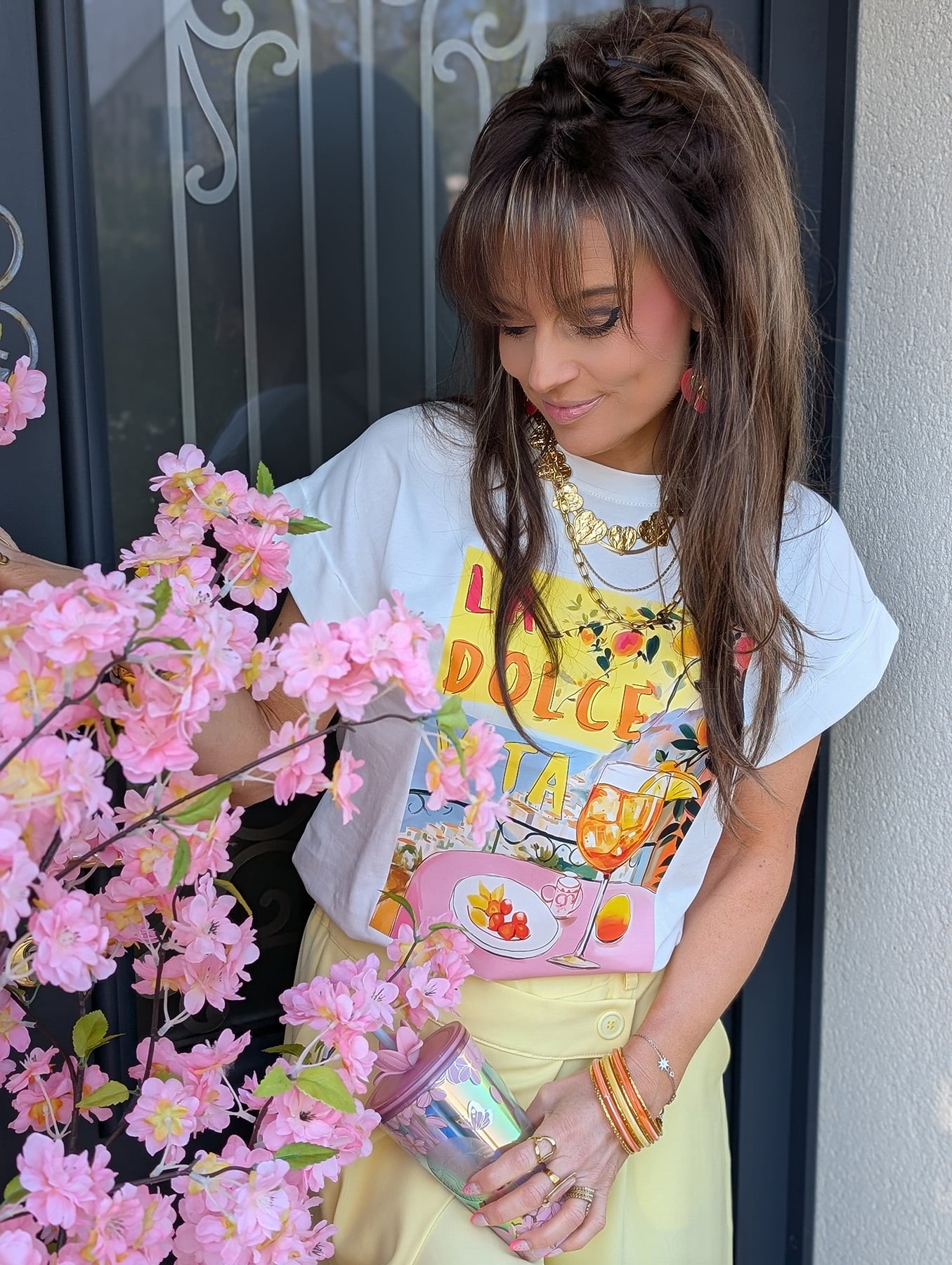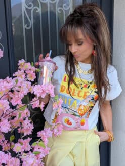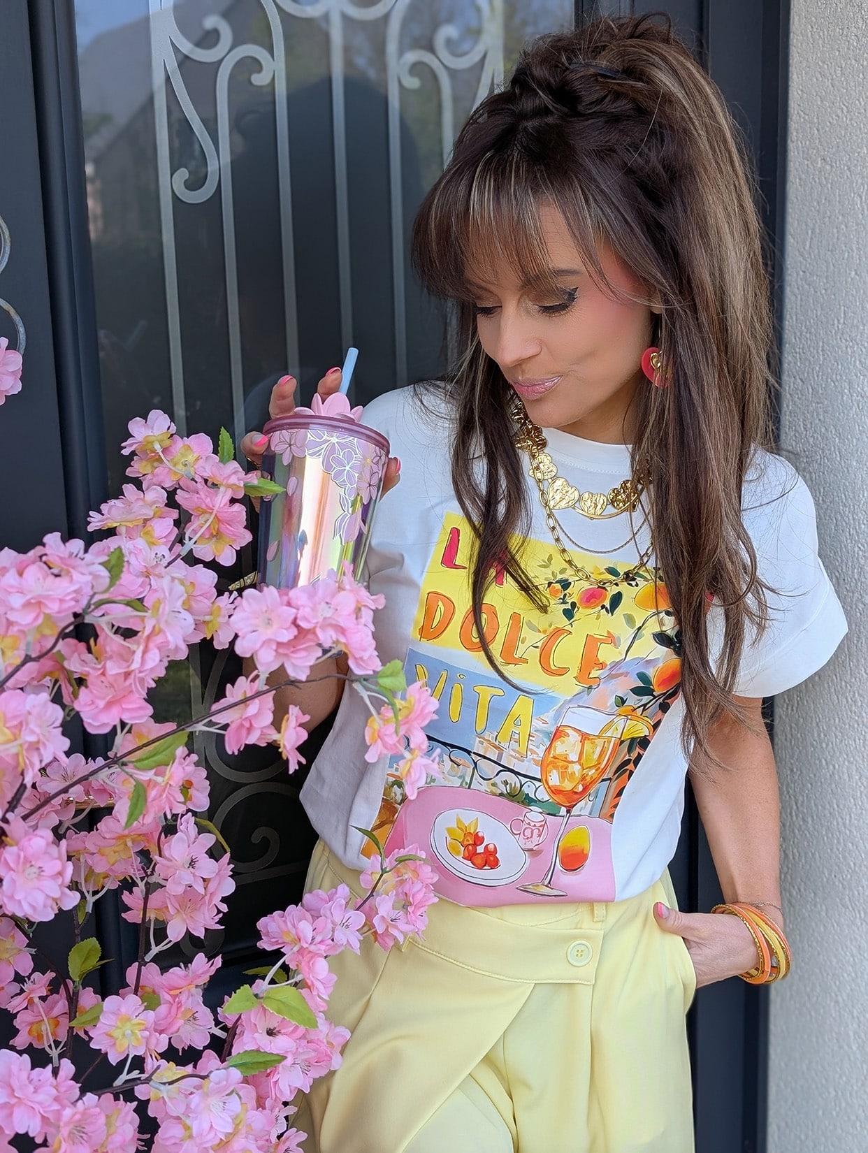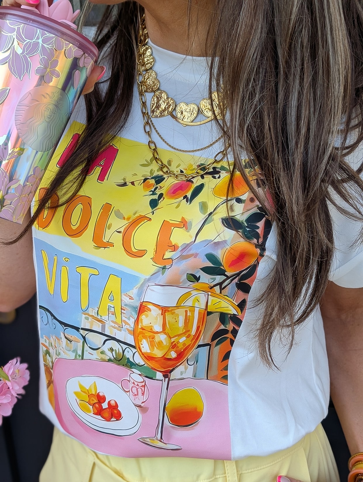Un imprimé fantaisie sur la face avant « La Dolce Vita ». L’esprit méditerranéen se fait ressentir dans son illustration italienne colorée !
