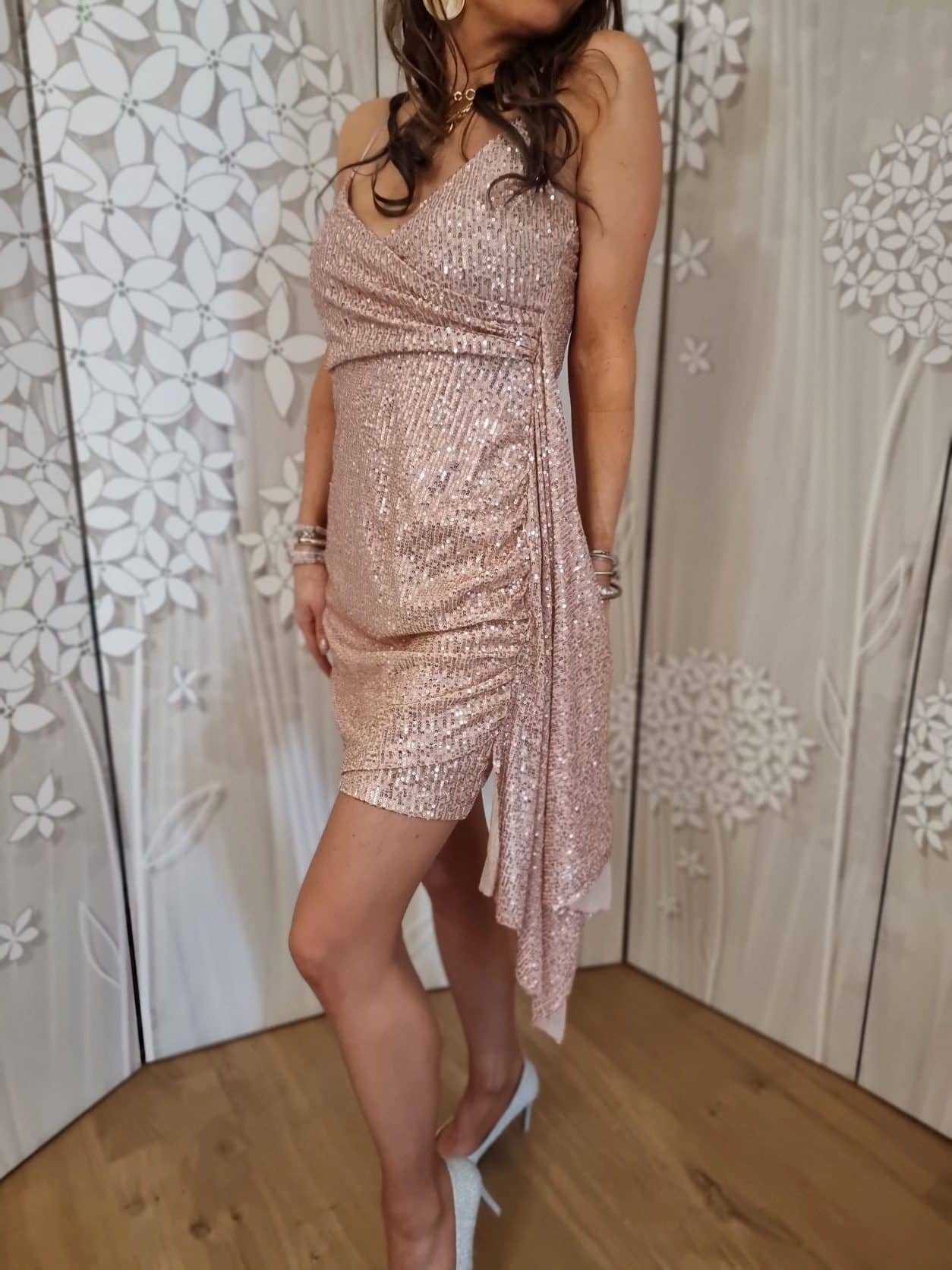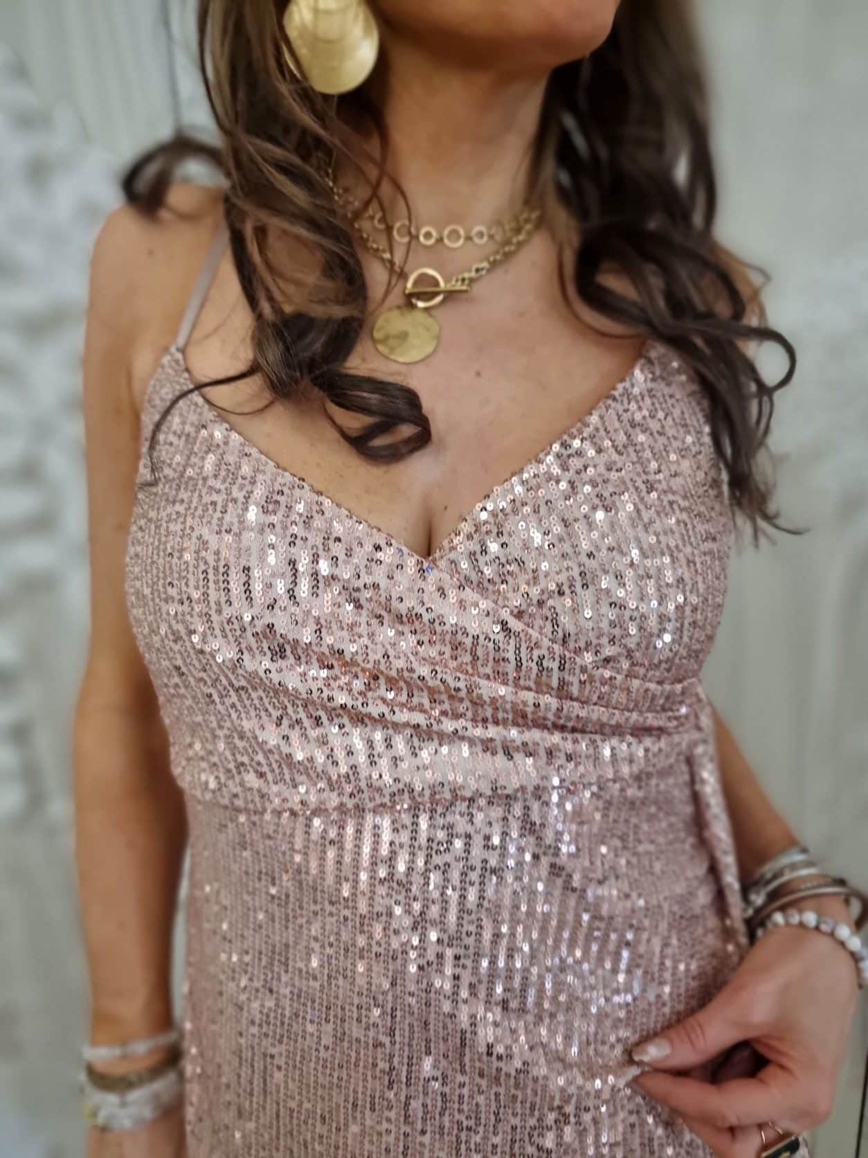 👗 Glamour Lumineux : Cette robe est l’incarnation du style élégant et festif. Les sequins étincelants captent la lumière. Son décolleté cache-cœur offre une touche tendance et flatteuse à votre silhouette.