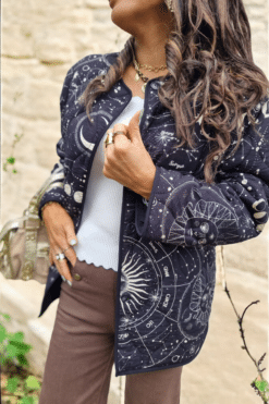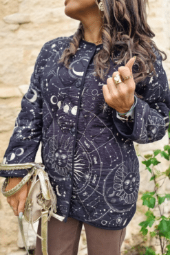 🌌 Voyagez au Cœur de l’Univers : Enfilez cette veste finement matelassée et laissez-vous emporter par son imprimé galaxie noir et crème.