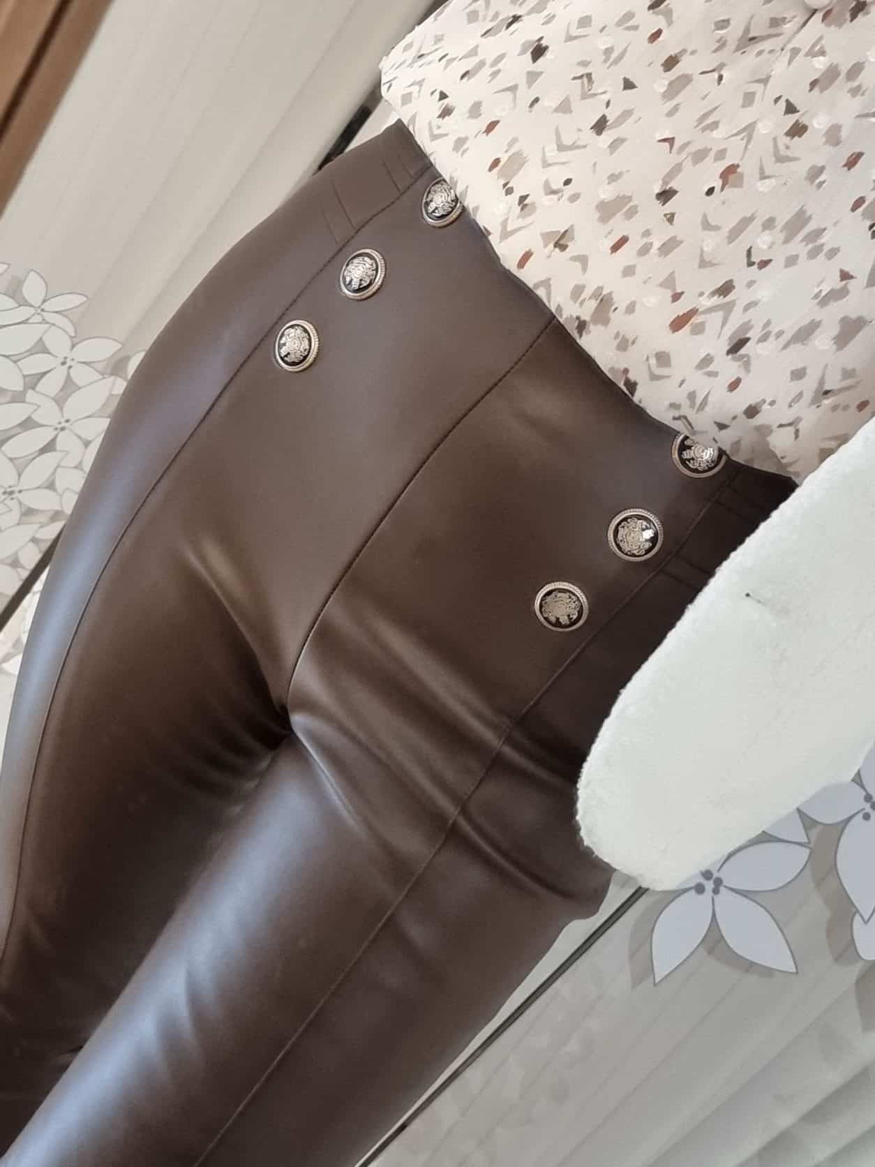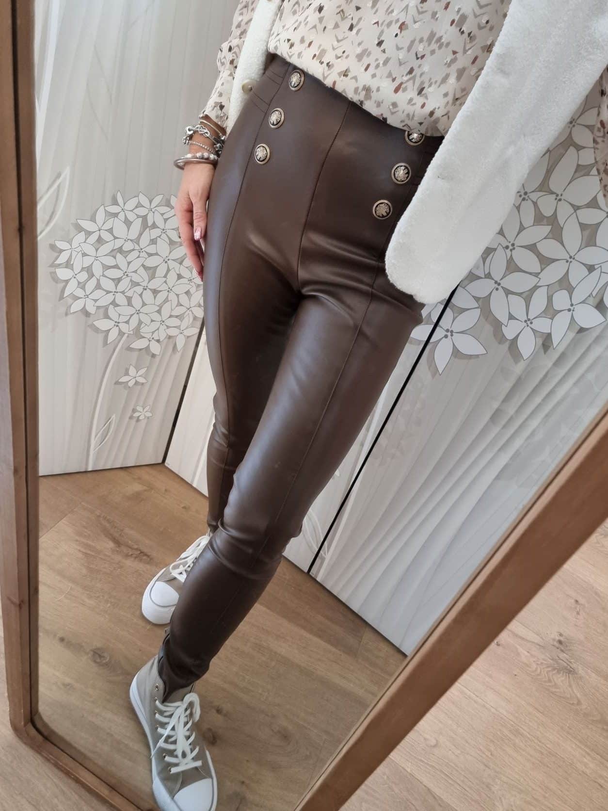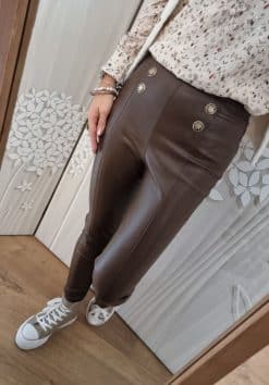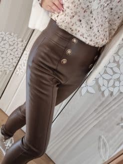 🍫 Adoptez l’élégance avec notre Legging en Simili Cuir Chocolat, Ornements de Boutons Fantaisie, et Couture Centrale pour un Look Habillé et Original ! 🍫