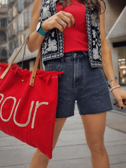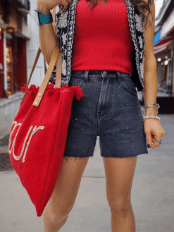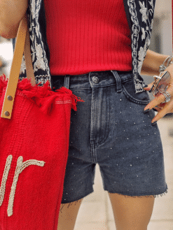 🌟 Sublimez votre look avec notre short en jean coupe droite ! 💎 Les strass soigneusement disposés sur tout le devant ajoutent une touche d’éclat à ce classique intemporel.
