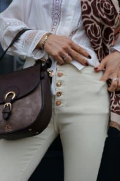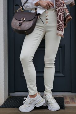 💫 Ce jean ne ressemble à aucun autre grâce à sa fermeture composée d’une rangée de boutons tous différents. Cette touche de fantaisie apporte une note d’originalité à votre tenue, vous démarquant avec élégance. 💫