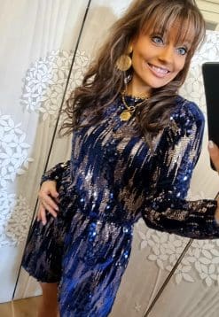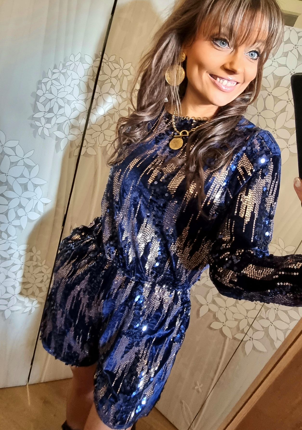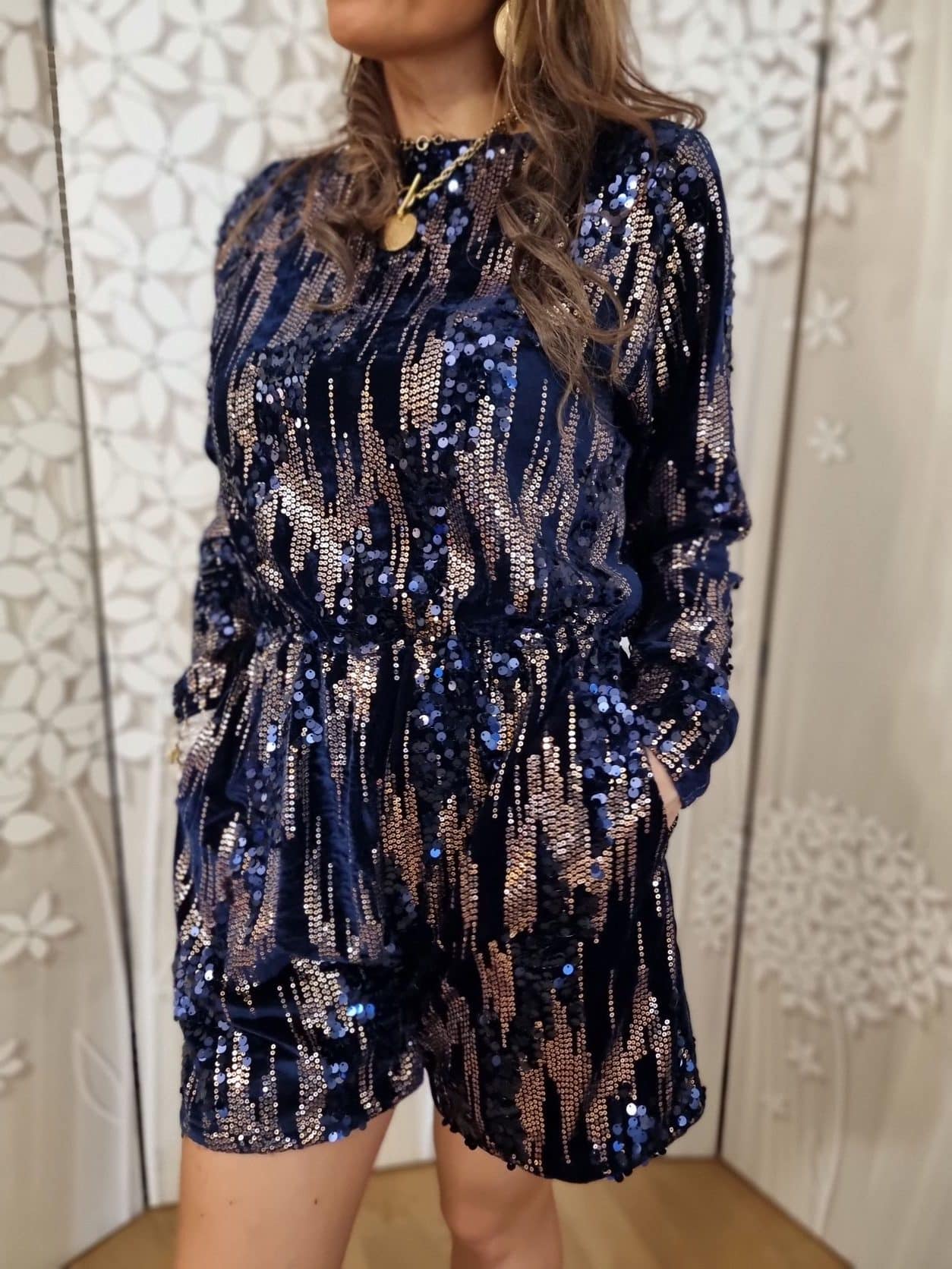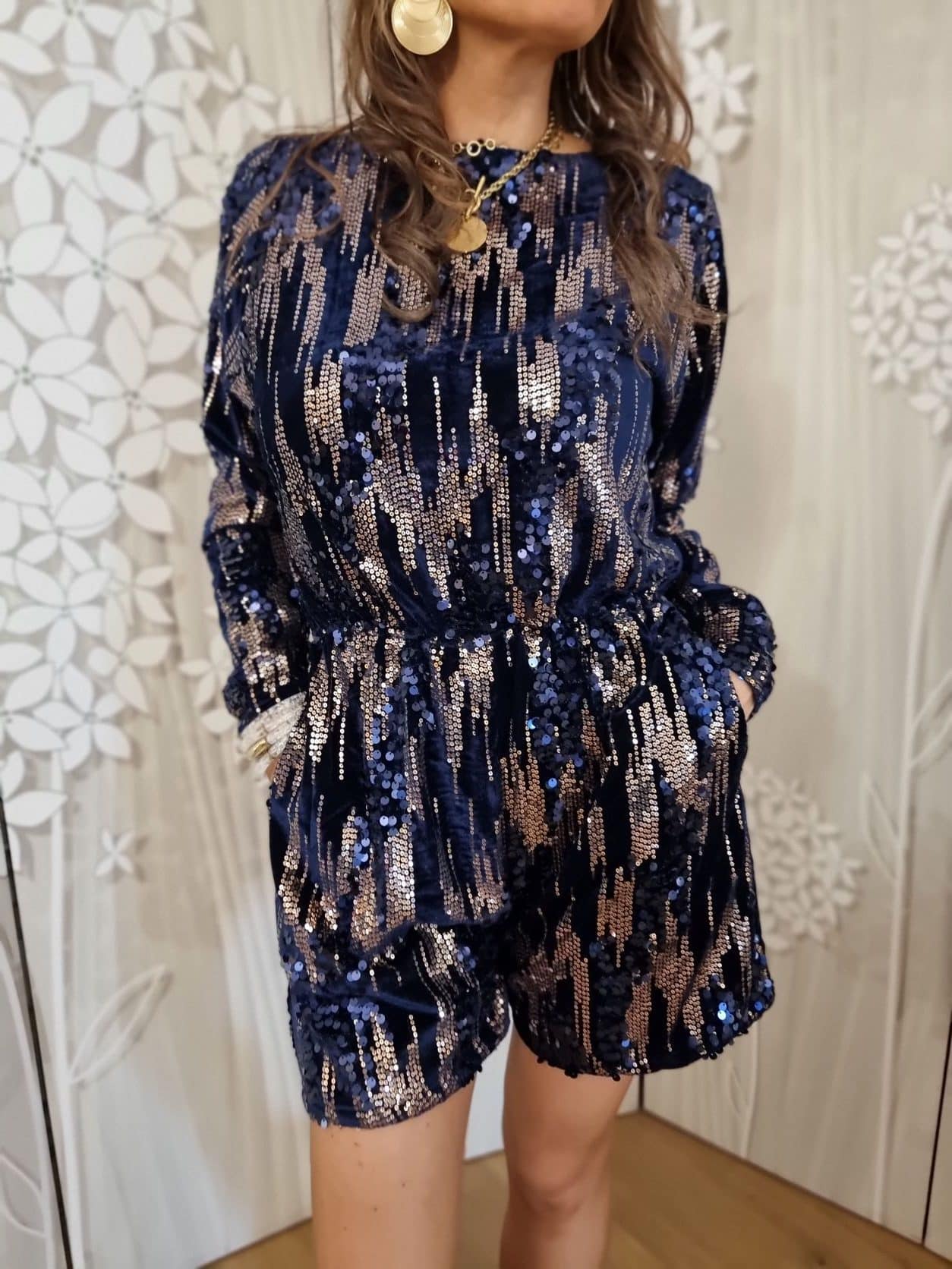 🌟 Éblouissez dans le scintillant ! Notre combishort est un mélange parfait de sequins bleus et bronze sur une matière veloutée. ✨